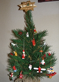 Aber der kleine sieht total niedlich aus und ist mit ganz altem Holzspielzeug von meiner Oma geschmückt. Kugeln passen nicht dran.